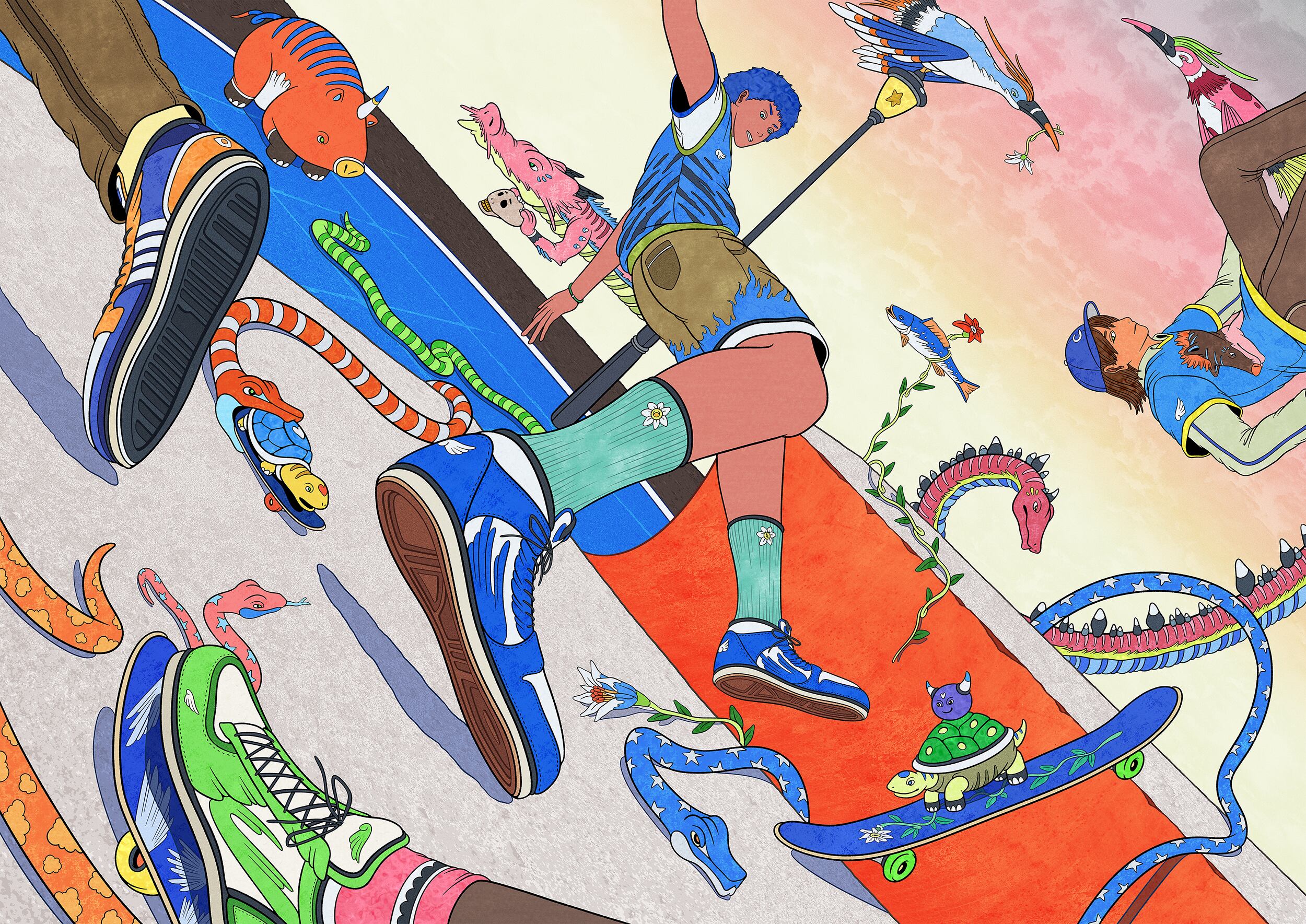 他人の持っているものが羨ましくなってしまう事もありますが、自分の持っているものや、今あるモノを大切にしましょうというタイトル。スニーカーとか生き物をたくさん描けたり、スケボー練習場の構図もダイナミックにかけたと思います。